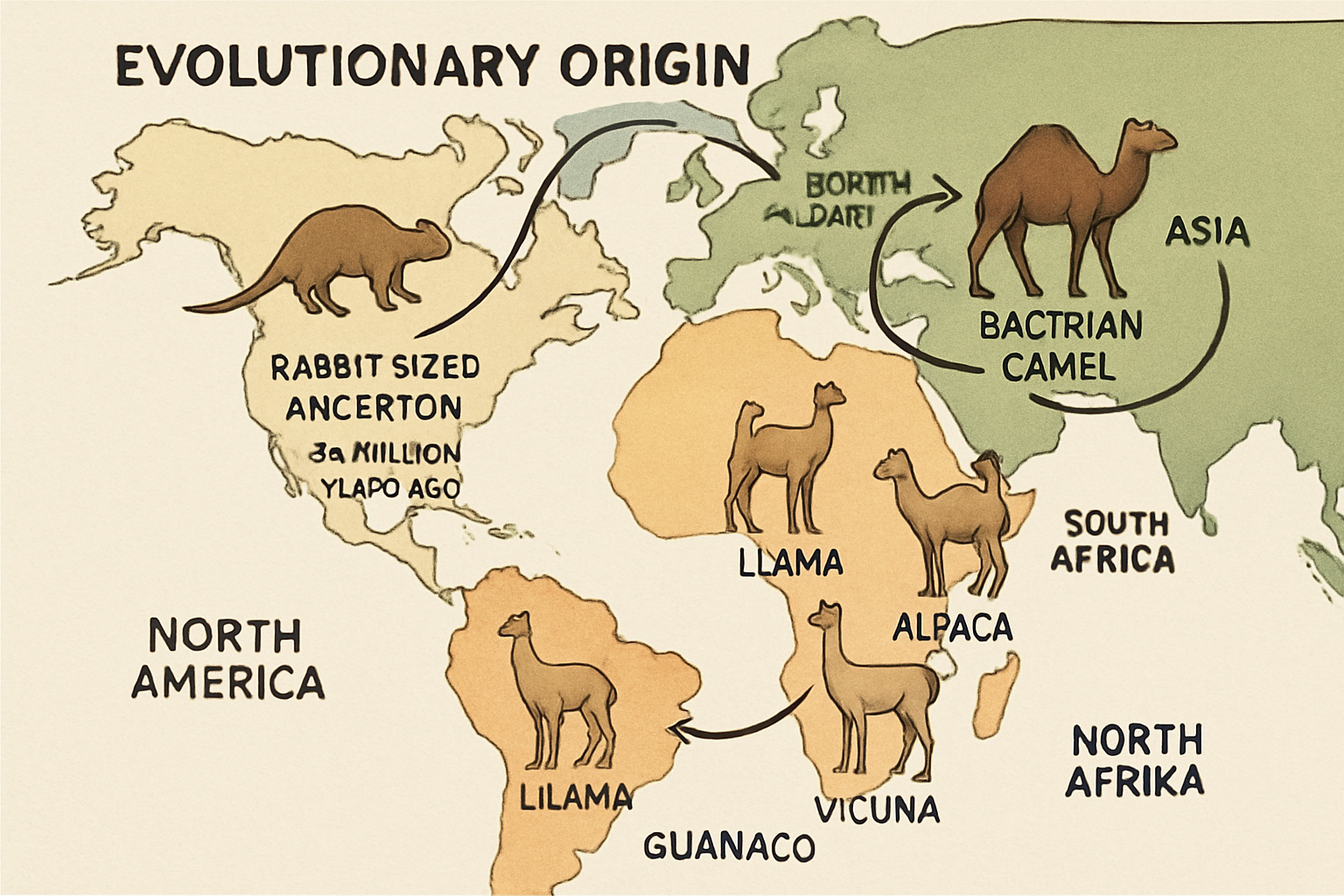 북미에서의 탄생과 대이동 - 약 4,000만 년 전, 지금의 토끼만 한 크기였던 낙타의 조상은 북아메리카에서 진화했다. 이후 빙하기가 찾아오자, 이들 중 일부는 베링 육교를 건너 아시아와 북아프리카로 이동했고, 다른 일부는 남쪽으로 내려갔다.