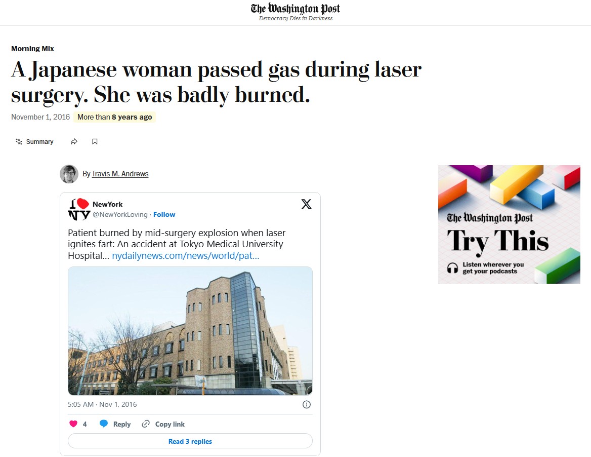 도쿄 의과대학 병원 (2016년)에서는 환자의 자궁경부 레이저 수술 중, 환자가 뀐 방귀에 레이저 불꽃이 옮겨붙어 수술포에 화재가 발생, 환자가 심각한 화상을 입은 사고가 있었다.