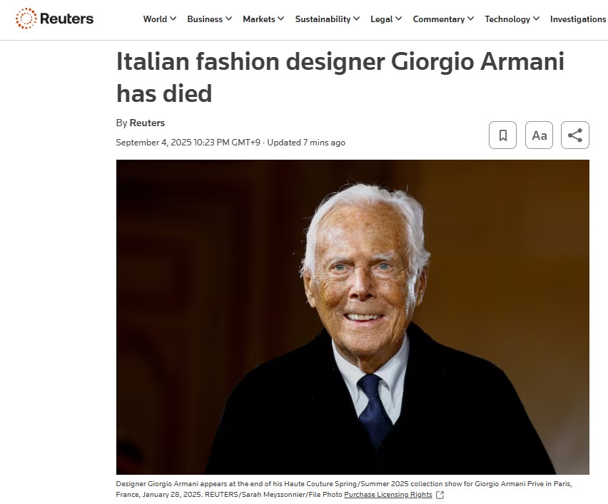 향년 91세의 아르마니는 현대 이탈리아 스타일과 우아함의 상징이었으며, 남성과 여성의 수트를 현대적인 감각으로 재해석한 인물로 꼽힌다.