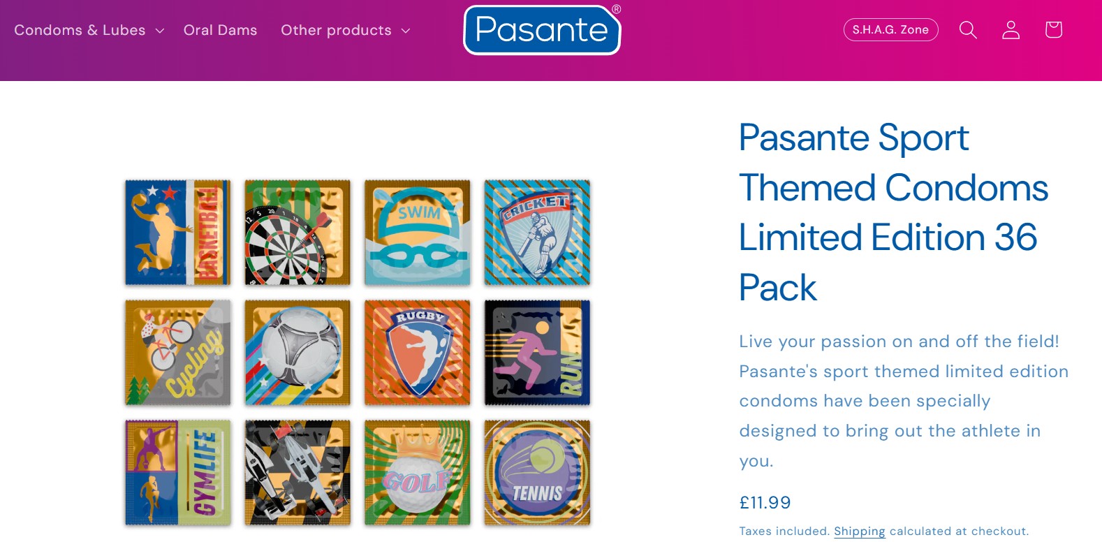 그런가 하면 유럽 콘돔 브랜드 Pasante는 2020년대 들어 축구, 럭비, 테니스, F1 레이싱, 수영 등 12개 스포츠를 모티브로 한 한정판 콘돔 세트를 발매하기도 했다.