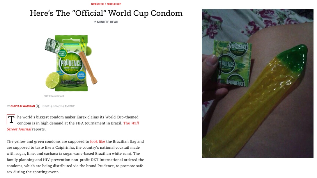 지난 2014년 브라질 월드컵에서는 브라질 국기를 형상화한 '공식' 콘돔이 등장하기도 했다. 녹색과 노란색으로 이루어진 이 콘돔은 브라질의 국민 칵테일인 카이피리냐 맛을 냈다고 전해진다.