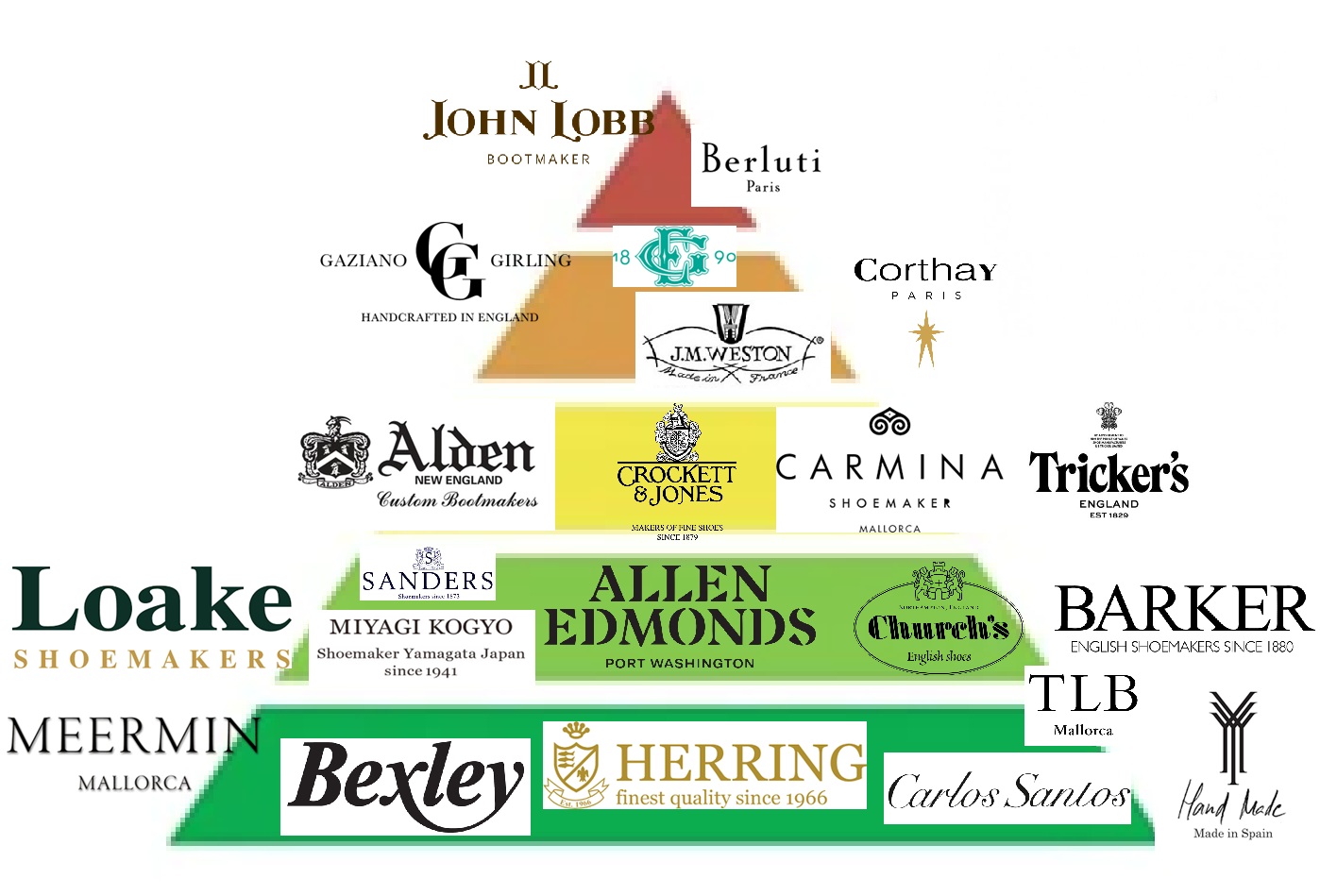 카를로스 산토스 (Carlos Santos, 포르투갈): 포르투갈을 대표하는 구두 브랜드. 아름다운 파티나 염색과 뛰어난 마감으로 가격대비 월등한 품질을 자랑한다.