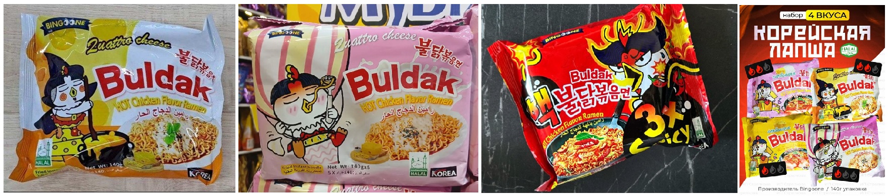 ‘불닭볶음면’의 포장 디자인이나 로고 배치가 매우 유사하며, “KOREA” 마크나 “HALAL” 인증 마크 등을 부착하여 진짜 한국 제품처럼 보이게 함.