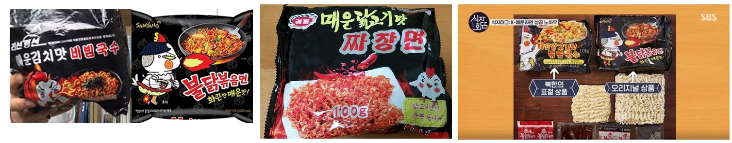 북한이 중국 시장을 대상으로 한 제품. “Spicy Kimchi Bibim Guksu”라는 제품 이름으로, 불닭볶음면과 매우 유사한 패키지 스타일과 디자인 요소 사용.