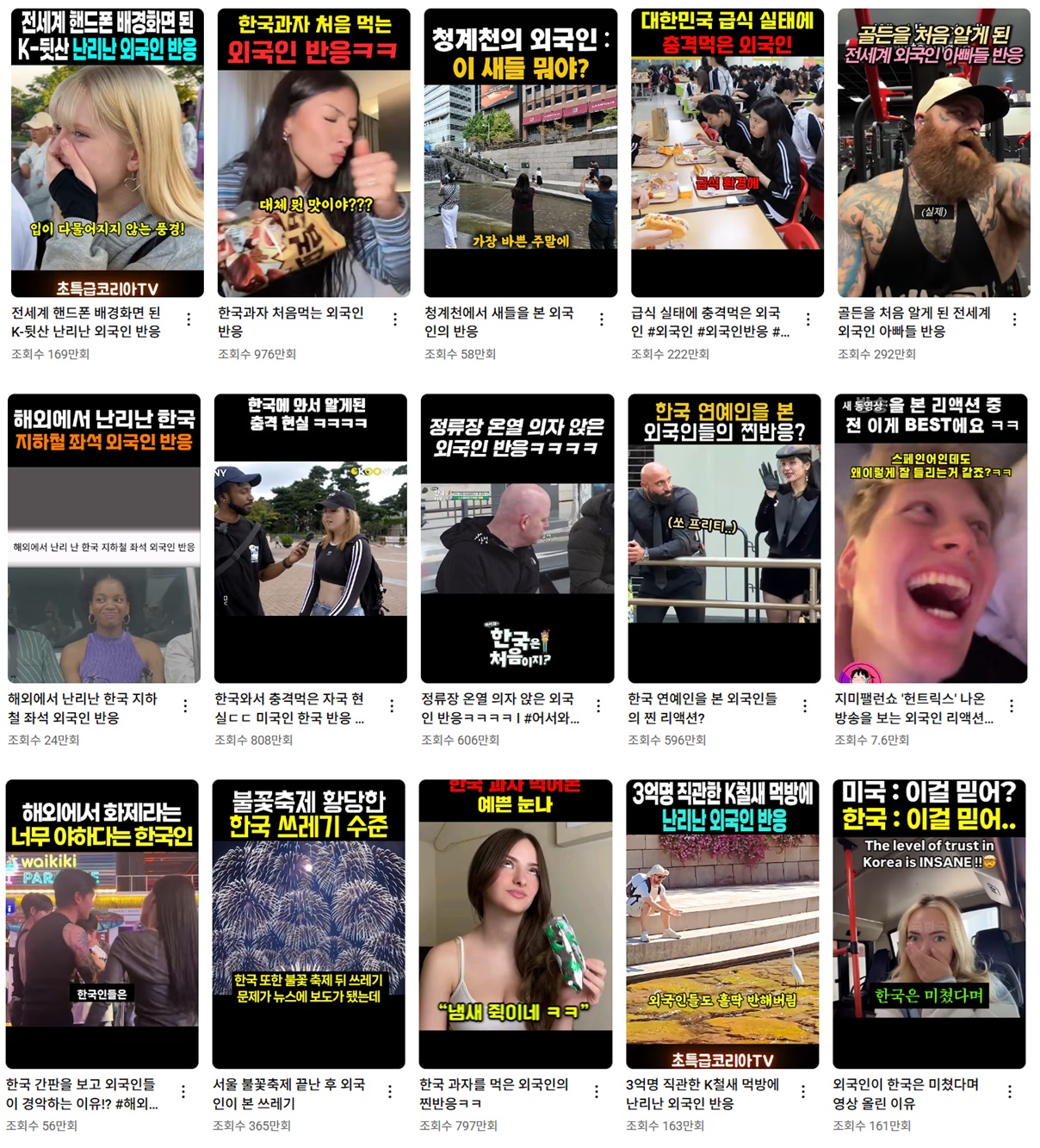 하지만 이 '외국인'의 범위는 놀라울 정도로 편향되어 있다. 우리보다 경제적으로 부유한, 소위 '선진국'이라 불리는 국가 출신의 백인들의 반응이 압도적인 조회수와 호응을 얻는다. 아시아나 아프리카, 남미인의 긍정적인 반응은 상대적으로 큰 주목을 받지 못한다.