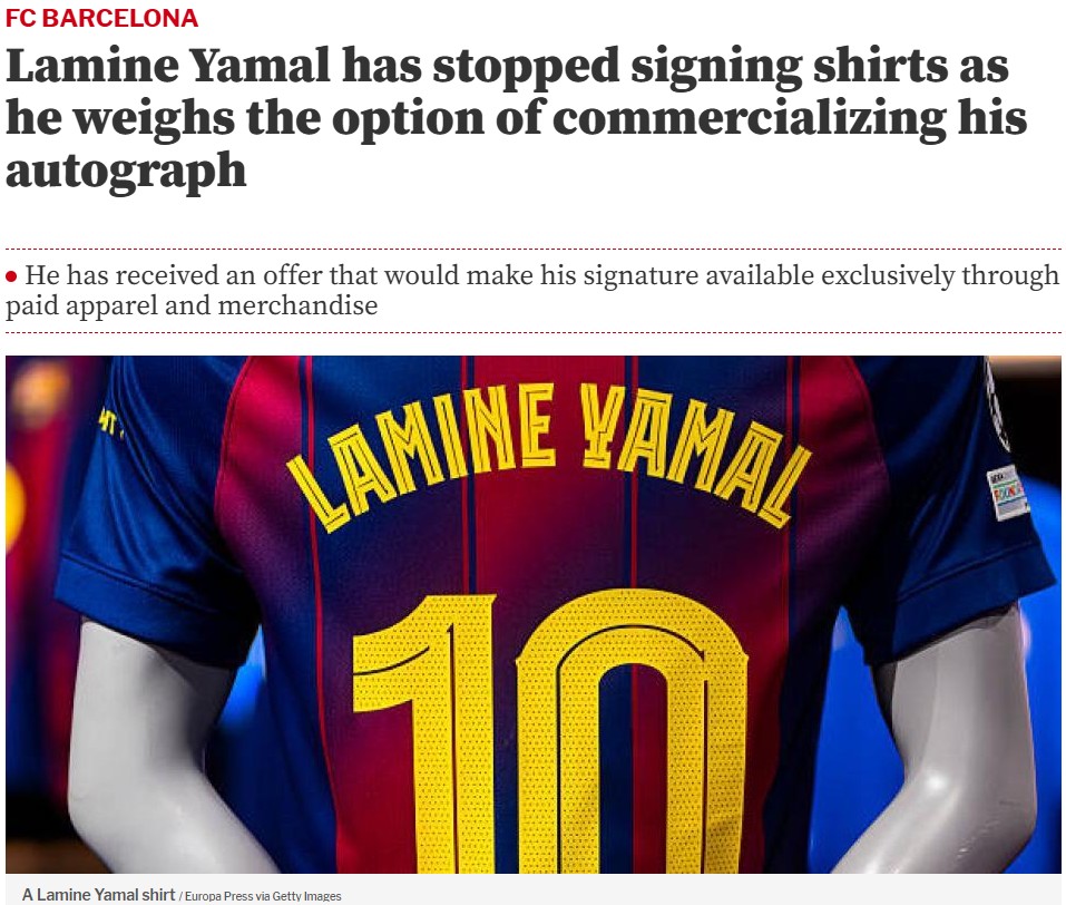 이제 막 18살이 된 축구 천재, 라민 야말이 벌써부터 축구장 밖에서 구설에 오르고 있다. 최근 해외 매체들의 보도에 따르면, 그는 자신의 사인을 상품화하려는 전문 업체의 제안을 긍정적으로 검토 중이며, 그의 매니지먼트 팀은 이미 "무분별한 사인 금지" 지침까지 내렸다고 한다. 만약 이 보도가 사실이라면, 이는 단순히 어린 스타의 미숙한 판단을 넘어, 스타와 팬의 관계를 지탱하는 근본적인 가치를 착각하고 있는 심각한 문제다.