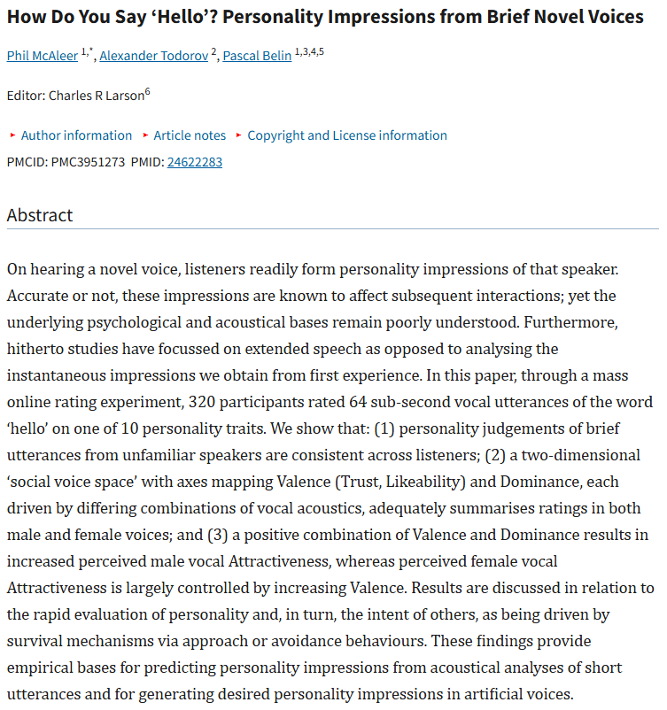 낯선 사람의 “Hello”라는 짧은 음성(1초 미만)을 들려주고, 청자들에게 화자의 성격을 평가하게 한 것이다.