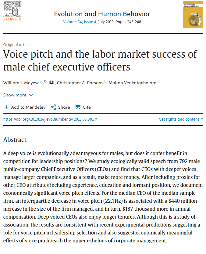 실제로 CEO를 대상으로 한 연구에서도, 음성의 높낮이가 능력·영향력에 대한 사회적 평가와 연결되어 있을 가능성이 있다는 것을 보여준다.