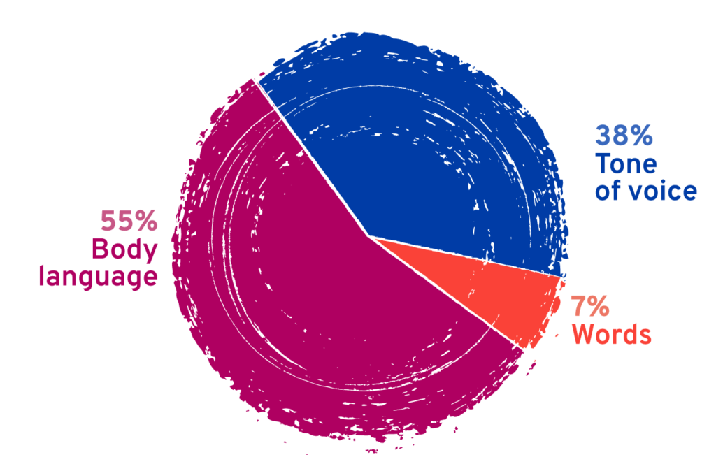 종종 인용되는 메라비언의 법칙(The Law of Mehrabian, 55–38–7)은 과장되어 알려진 면이 있지만, 한 가지 중요한 메시지는 분명하다.