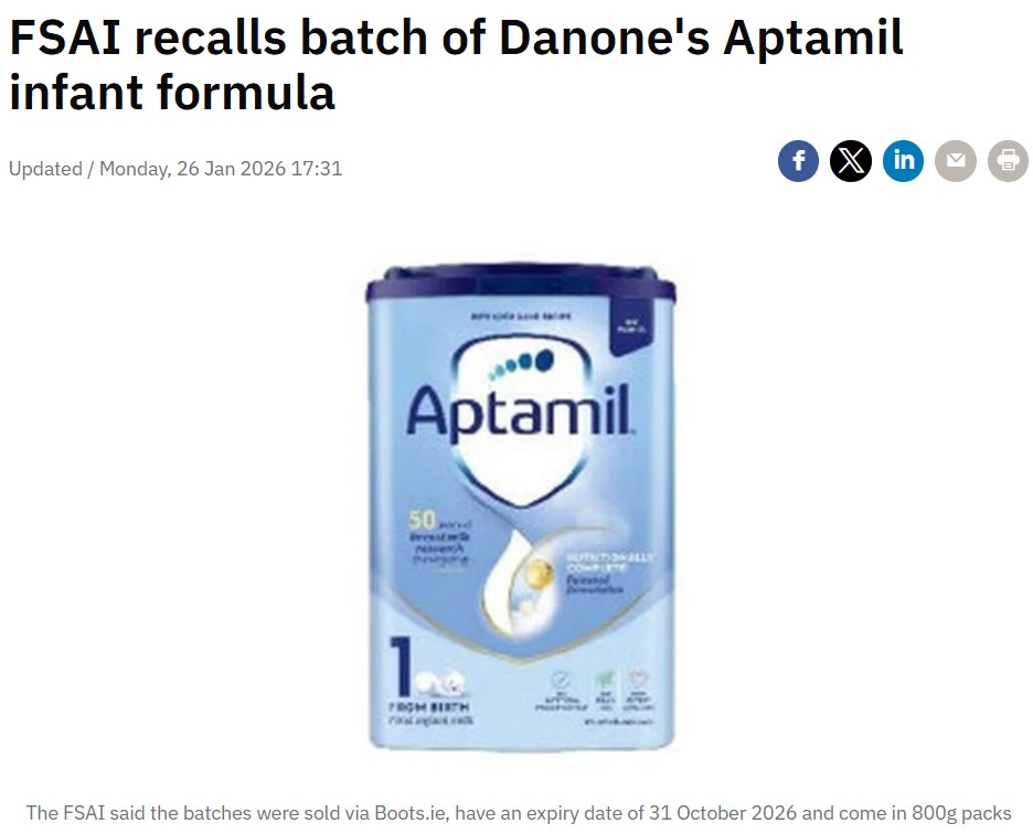 배경: 분유 제조에 들어가는 특정 원료(중국산 ARA 오일로 추정)가 오염된 것으로 보이며, 이 원료를 납품받은 다논(Danone), 네슬레(Nestlé), 비타제민(Vitagermine) 등 여러 글로벌 제조사가 동시다발적으로 리콜을 진행하고 있다.