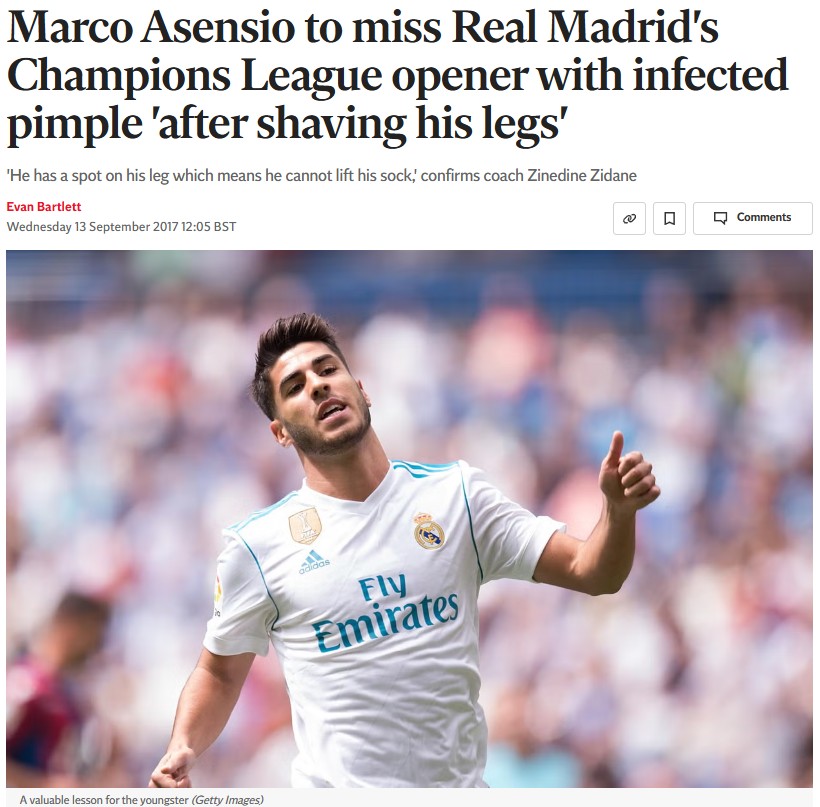 2017년, 레알 마드리드의 스타 플레이어 마르코 아센시오(Marco Asensio)가 챔피언스리그 경기에 결장하는 일이 발생했다. 부상 명단에 오른 이유는 다름 아닌 '다리 제모 중 발생한 감염' 때문이었다.