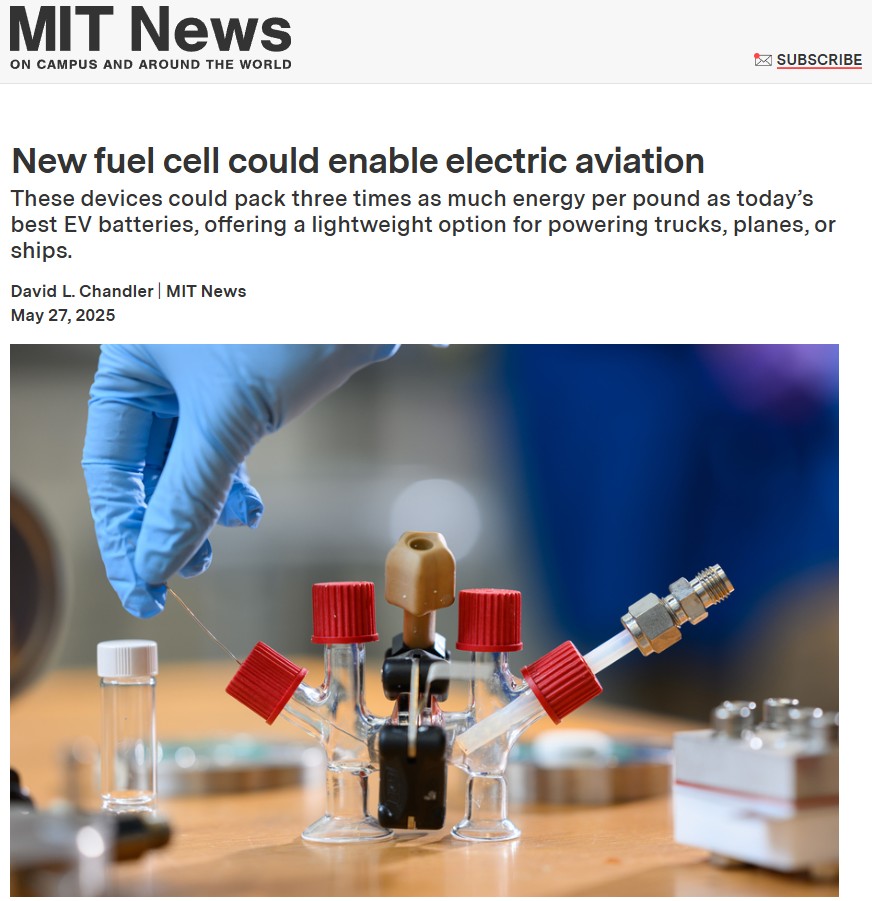 ▲ 혁신적 연료전지의 등장 (MIT): 2025년 5월, MIT 연구진은 항공용으로 특화된 새로운 고체산화물 연료전지(SOFC) 기술을 발표했다. 기존 연료전지보다 훨씬 가볍고 열효율이 뛰어나 수소 전기 비행기의 최대 약점인 시스템 중량 문제를 획기적으로 개선할 수 있는 성과로 평가받고 있다.