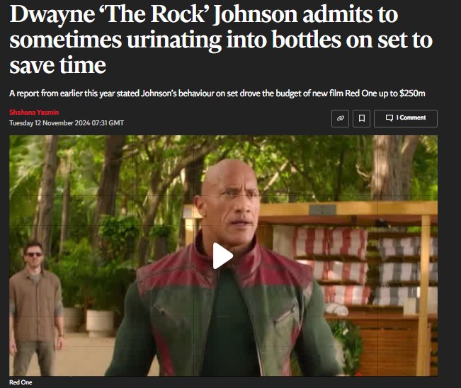 영화 <레드 원(Red One)> 촬영 당시, 연예 매체 '더 랩(The Wrap)'은 드웨인 존슨이 촬영장에 최대 8시간씩 상습적으로 지각하여 제작비 폭등의 원인이 되었다고 폭로했다. 가장 충격적인 내용은 그가 화장실 가는 시간을 아끼기 위해 물병에 소변을 보고, 이를 스태프들에게 버리라고 지시했다는 주장이었다.